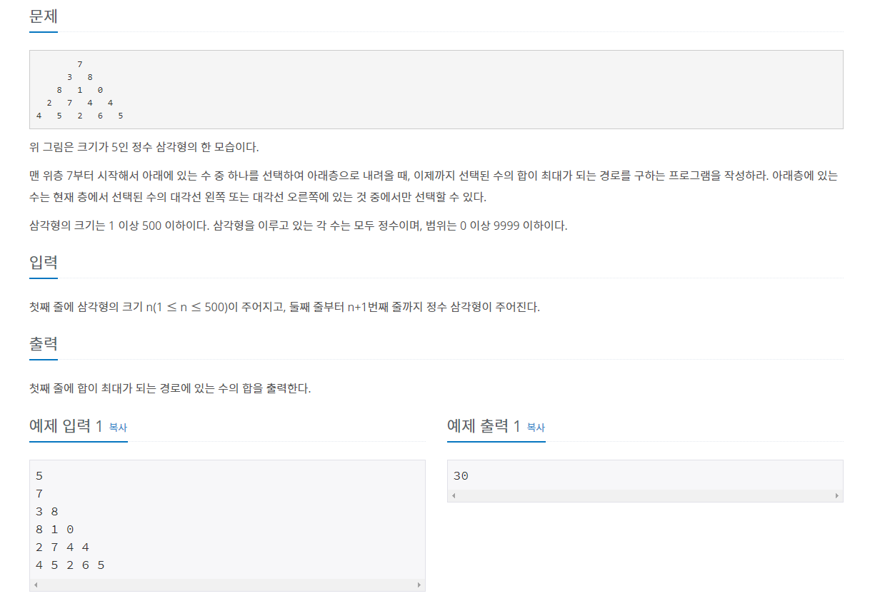 첫째 줄에 삼각형의 크기 n(1 ≤ n ≤ 500)이 주어지고, 둘째 줄부터 n+1번째 줄까지 정수 삼각형이 주어진다.