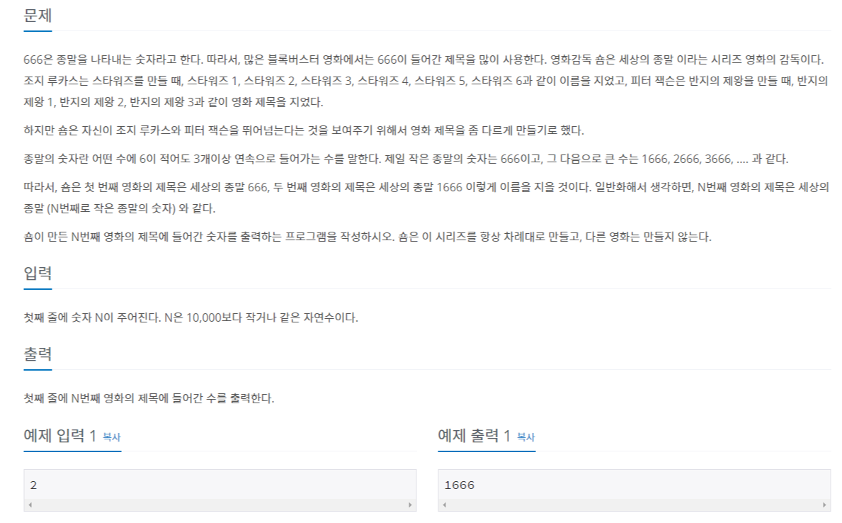 여기서 find함수는 "666"이라는 문자열이 시작된 위치를 return하는데, 이게 -1이 아닌 모든 경우에 시리즈물의 숫자가 될 수 있기 때문에 시리즈 숫자를 올린다.(가장 작은 시리즈 값에서 시작했으므로 당연히 시리즈 숫자중 가장 작은 수 도출) 그리고 "666"이 아예들어가지 않는 경우는 시리즈물 숫자가 될 수 없으므로 그냥 지나친다.