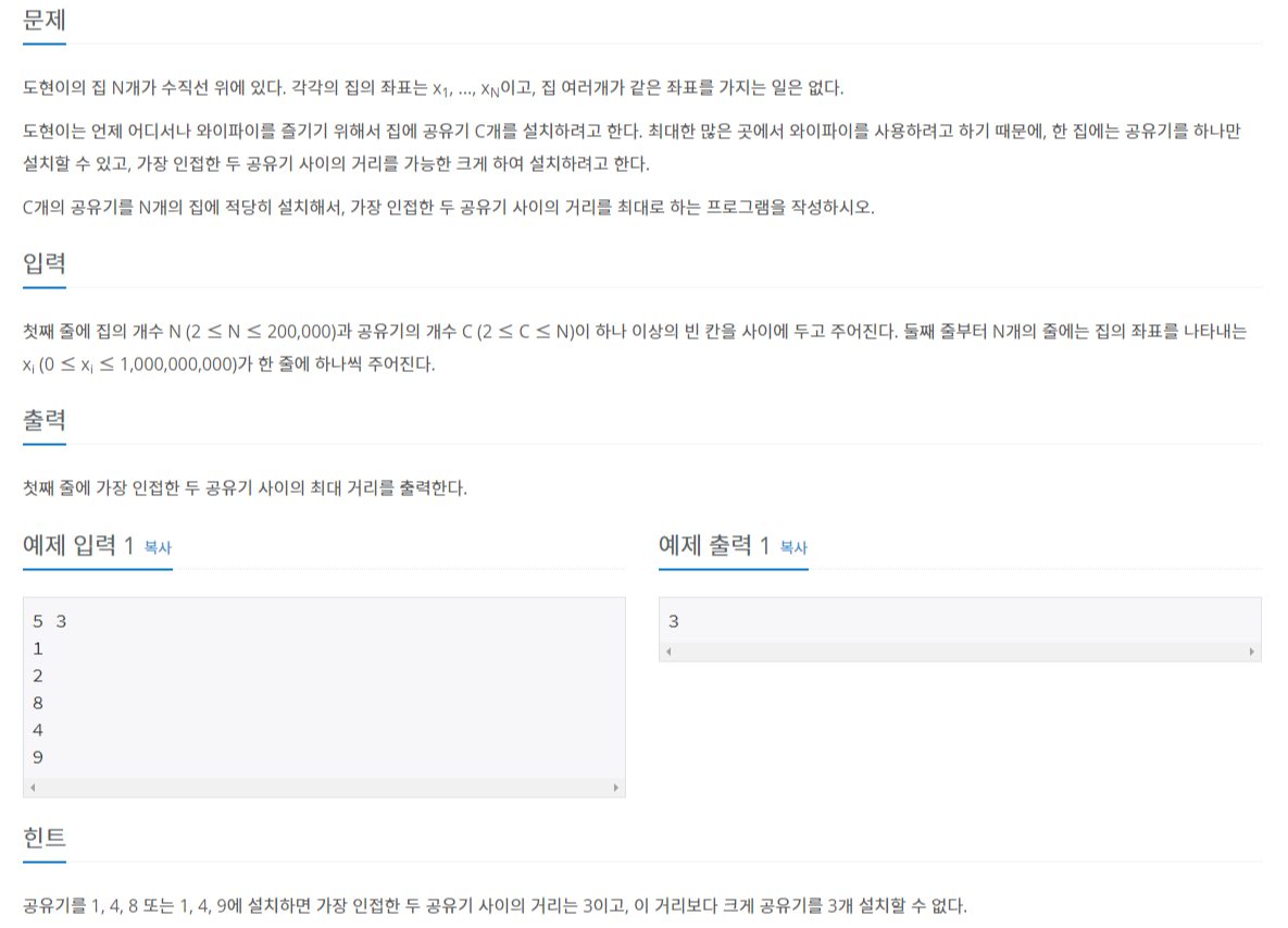 첫째 줄에 집의 개수 N (2 ≤ N ≤ 200,000)과 공유기의 개수 C (2 ≤ C ≤ N)이 하나 이상의 빈 칸을 사이에 두고 주어진다. 둘째 줄부터 N개의 줄에는 집의 좌표를 나타내는 xi (0 ≤ xi ≤ 1,000,000,000)가