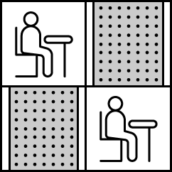 | 응시자가 앉아있는 자리(P)를 의미합니다. | 빈 테이블(O)을 의미합니다. | 파티션(X)을 의미합니다. |