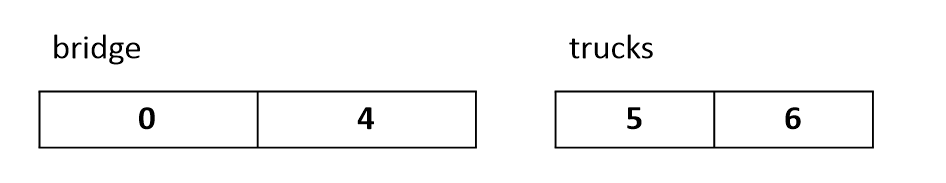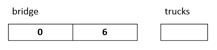 강을 가로지르는 하나의 차선으로 된 다리가 하나 있다. 이 다리를 n 개의 트럭이 건너가려고 한다. 트럭의 순서는 바꿀 수 없으며, 트럭의 무게는 서로 같지 않을 수 있다. 다리 위에는 단지 w 대의 트럭만 동시에 올라갈 수 있다. 다리의 길이는 w 단위길이(unit distance)이며, 각 트럭들은 하나의 단위시간(unit time)에 하나의 단위길이만큼만 이동할 수 있다고 가정한다. 동시에 다리 위에 올라가 있는 트럭들의 무게의 합은 다리의 최대하중인 L보다 작거나 같아야 한다. 참고로, 다리 위에 완전히 올라가지 못한 트럭의 무게는 다리 위의 트럭들의 무게의 합을 계산할 때 포함하지 않는다고 가정한다.
