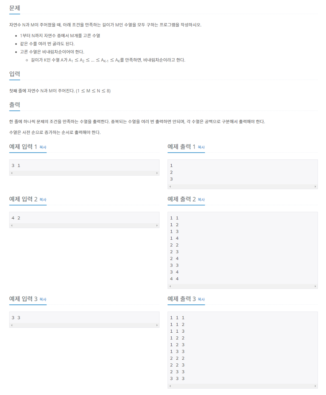 한 줄에 하나씩 문제의 조건을 만족하는 수열을 출력한다. 중복되는 수열을 여러 번 출력하면 안되며, 각 수열은 공백으로 구분해서 출력해야 한다. 수열은 사전 순으로 증가하는 순서로 출력해