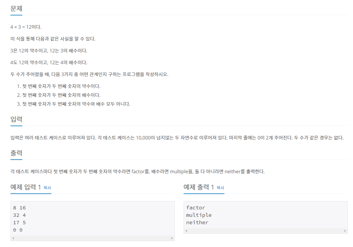 각 테스트 케이스마다 첫 번째 숫자가 두 번째 숫자의 약수라면 factor를, 배수라면 multiple을, 둘 다 아니라면 neither를 출력한다.