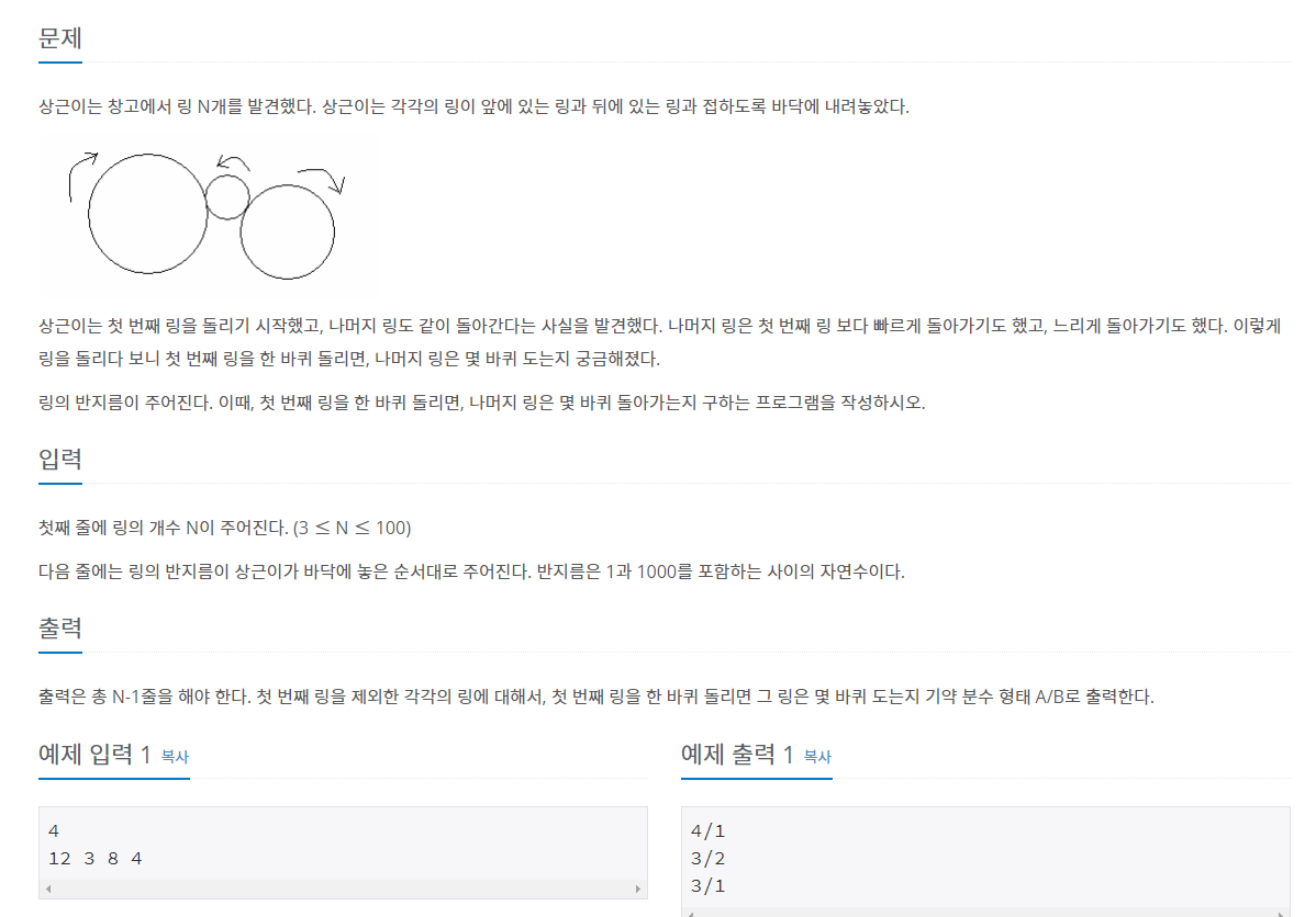 출력은 총 N-1줄을 해야 한다. 첫 번째 링을 제외한 각각의 링에 대해서, 첫 번째 링을 한 바퀴 돌리면 그 링은 몇 바퀴 도는지 기약 분수 형태 A/B로 출력한다.