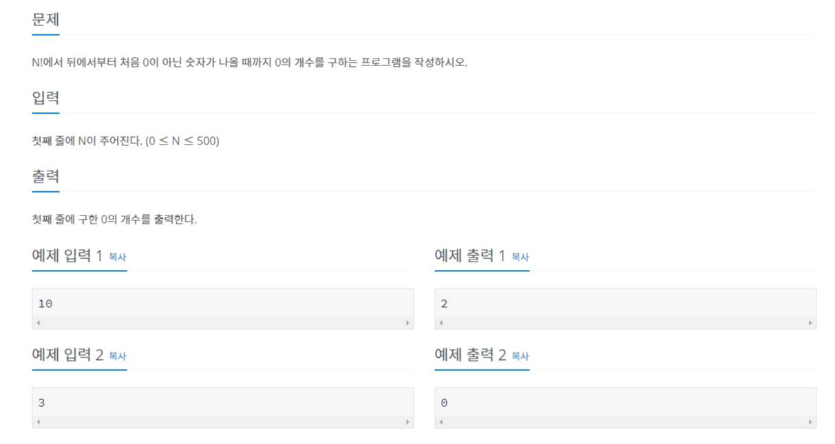 N이 500까지 들어올 수 있기 때문에 이를 계산한 값을 구해서 0의 개수를 세려면 변수형 선언이 어렵다.