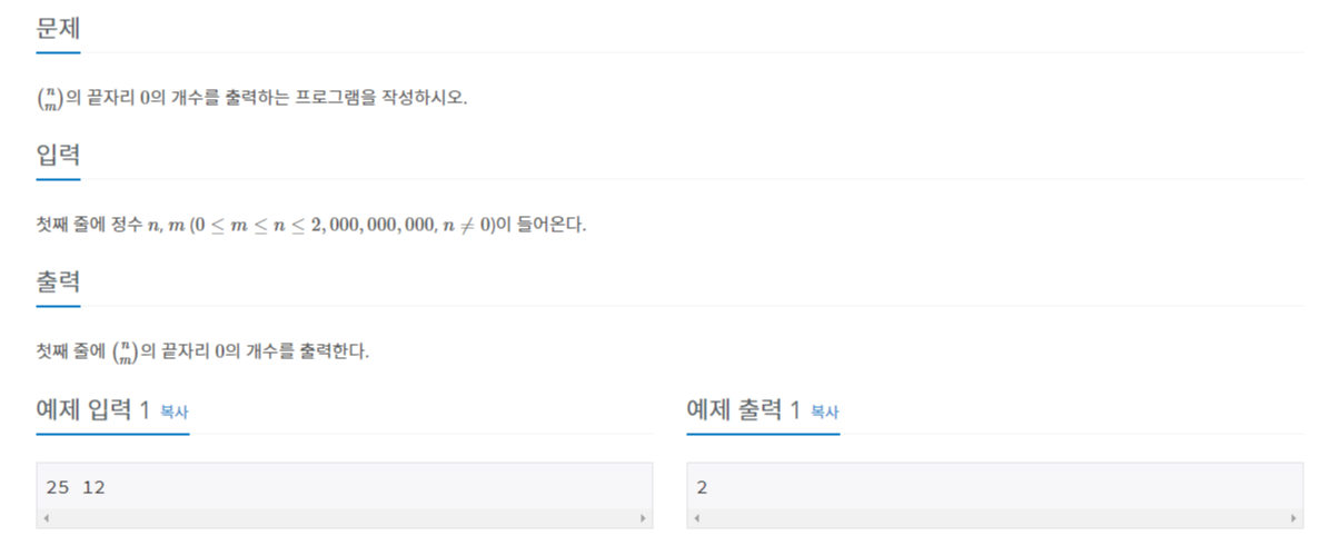 방법1. (N!의 2의 개수 - (N-M)!의 2의 개수 - M!의 2의개수)와 (N!의 5의 개수 - (N-M)!의 5의 개수 - M!의 5의개수)의 최솟값 ( 메모리 : 2016KB 시간 : 0ms )