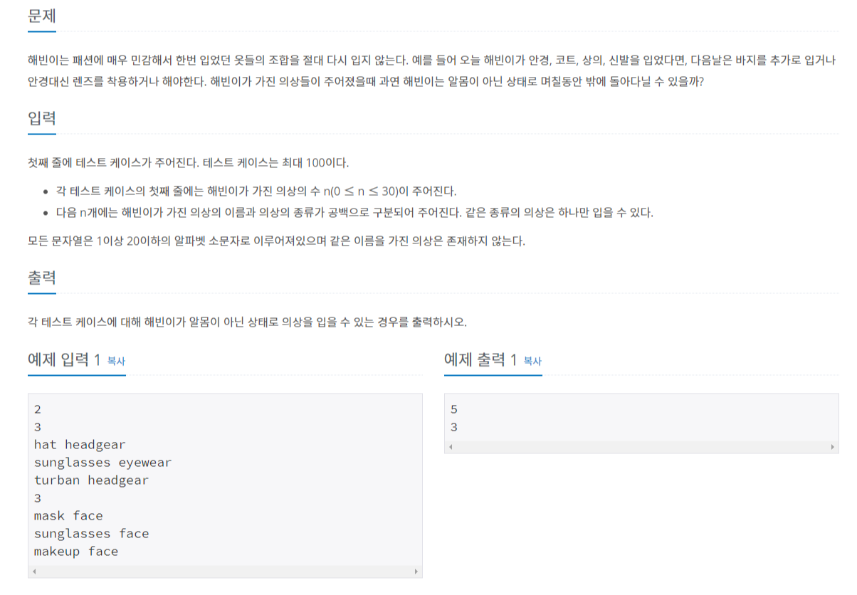 첫 번째 테스트 케이스는 headgear에 해당하는 의상이 hat, turban이며 eyewear에 해당하는 의상이 sunglasses이므로 (hat), (turban), (sunglasses), (hat,sunglasses), (turban,sunglasses)로 총 5가지 이다.