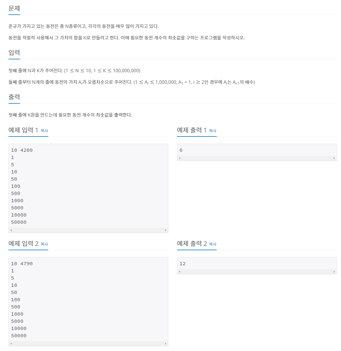 첫째 줄에 N과 K가 주어진다. (1 ≤ N ≤ 10, 1 ≤ K ≤ 100,000,000) 둘째 줄부터 N개의 줄에 동전의 가치 Ai가 오름차순으로 주어진다. (1 ≤ Ai ≤ 1,000,000, A1 = 1, i ≥ 2인 경우에 Ai는 Ai-1의 배수)