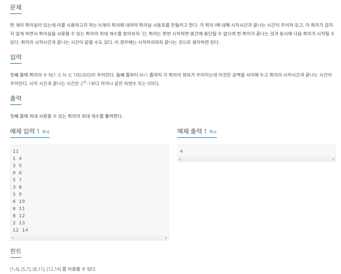 1) 회의가 빨리 끝나는 순으로 정렬(끝나는 시간이 똑같은 회의의 경우 시작시작이 이른 순으로)