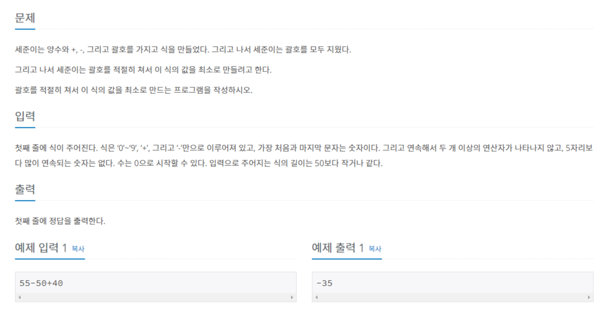 첫째 줄에 식이 주어진다. 식은 ‘0’~‘9’, ‘+’, 그리고 ‘-’만으로 이루어져 있고, 가장 처음과 마지막 문자는 숫자이다. 그리고 연속해서 두 개 이상의 연산자가 나타나지 않고, 5자리보다