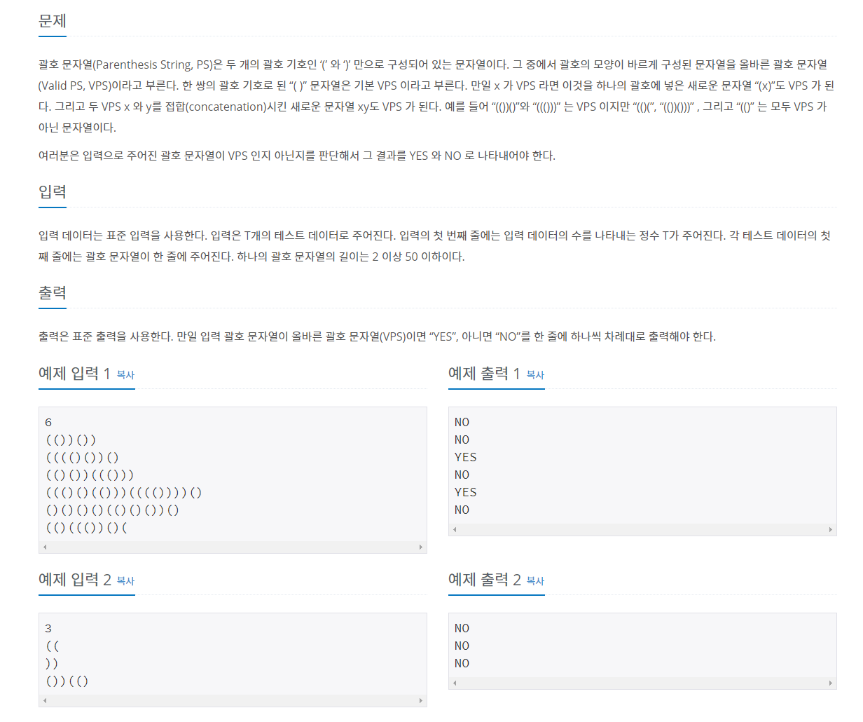 괄호 문자열(Parenthesis String, PS)은 두 개의 괄호 기호인 ‘(’ 와 ‘)’ 만으로 구성되어 있는 문자열이다. 그 중에서 괄호의 모양이 바르게 구성된 문자열을 올바른 괄호 문자열(Valid PS, VPS)이라고