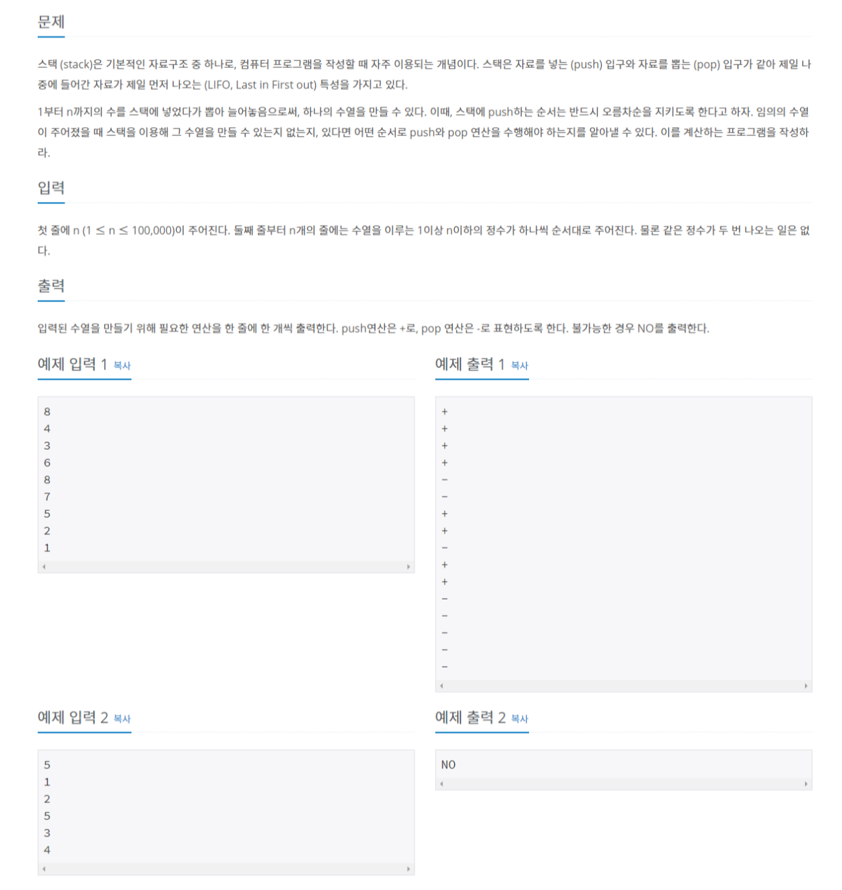 1부터 n까지에 수에 대해 차례로 [push, push, push, push, pop, pop, push, push, pop, push, push, pop, pop, pop, pop, pop] 연산을 수행하면 수열 [4, 3, 6, 8, 7, 5, 2, 1]을 얻을 수 있다.