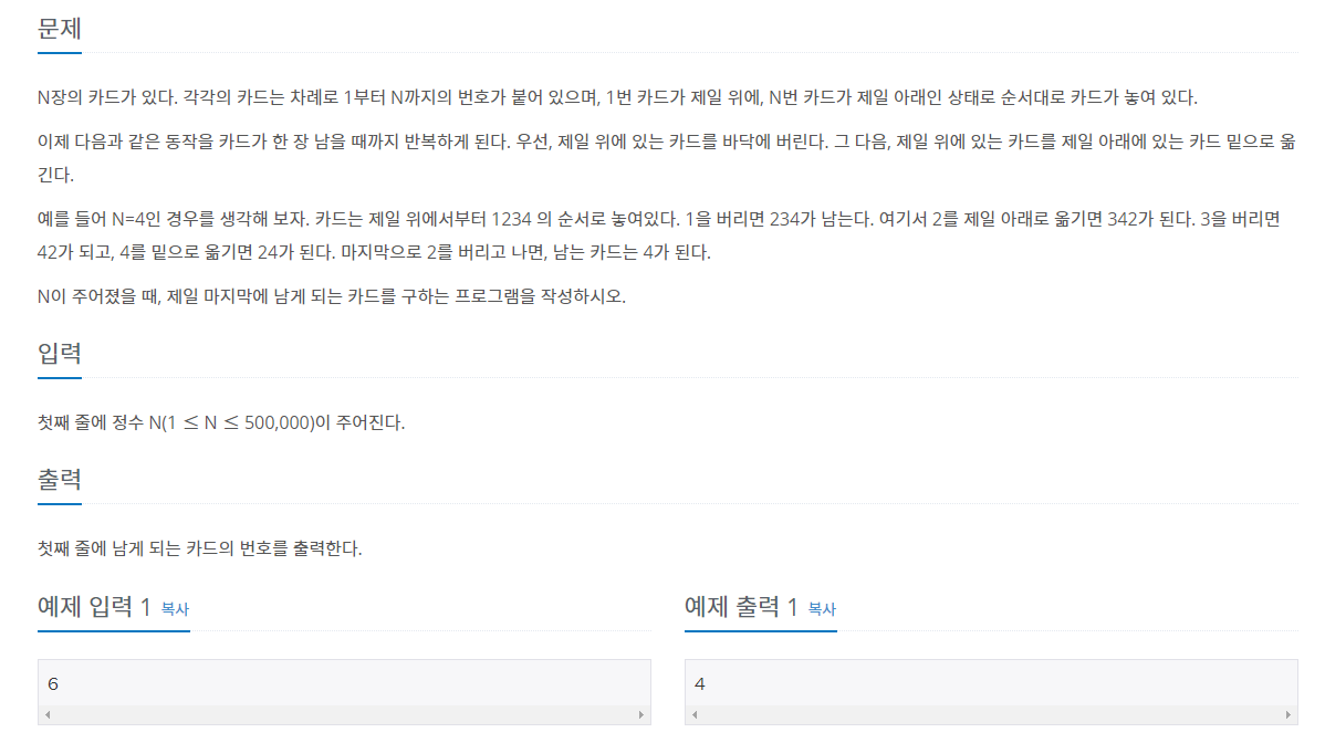 N장의 카드가 있다. 각각의 카드는 차례로 1부터 N까지의 번호가 붙어 있으며, 1번 카드가 제일 위에, N번 카드가 제일 아래인 상태로 순서대로 카드가 놓여 있다. 이제 다음과 같은 동작을 카드가