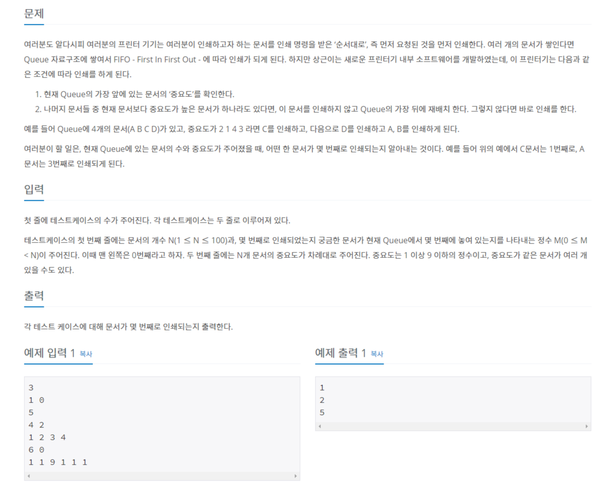 3) priority queue 와 queue를 비교하며 중요도가 높은 문서일땐 count를 증가(몇번째에 출력되는지 알기 위해)